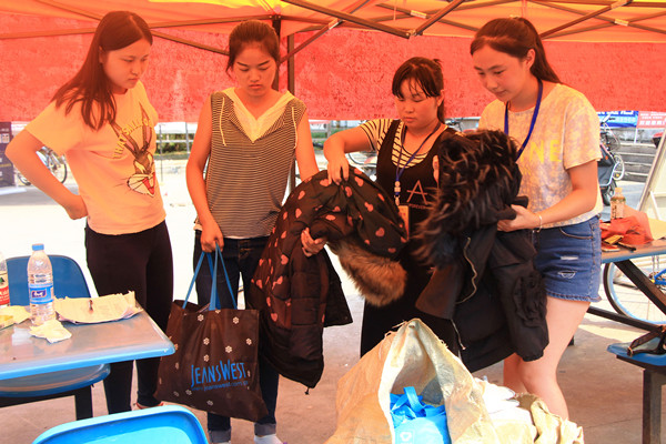 工作人员的热情和努力也得到了同学们的积极响应,活动参与者有230人左右。“之前就收拾好这些衣服准备捐出去,中午经过食堂看到这个活动,就回去拿衣服过来,我觉得‘绿色捐衣’活动很有意义,算是为那些需要帮助的人尽自己的一份力量吧。”旅游管理专业13级的光林林同学已经是第二次参加捐衣活动了,这次她和其他两位好朋友一共捐了九袋衣服。“这些军训服装以后也不会再穿了,放在宿舍也是浪费,不如捐出来给需要的人。”大一新生军训已经结束,外国语学院合作英语专业16级的张茹同学便捐出了自己的军训服装。