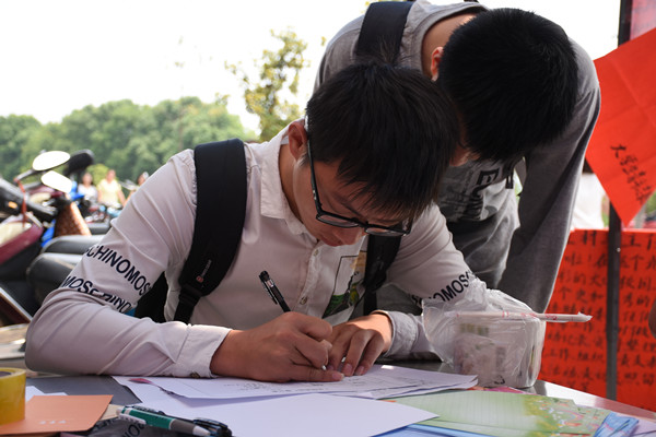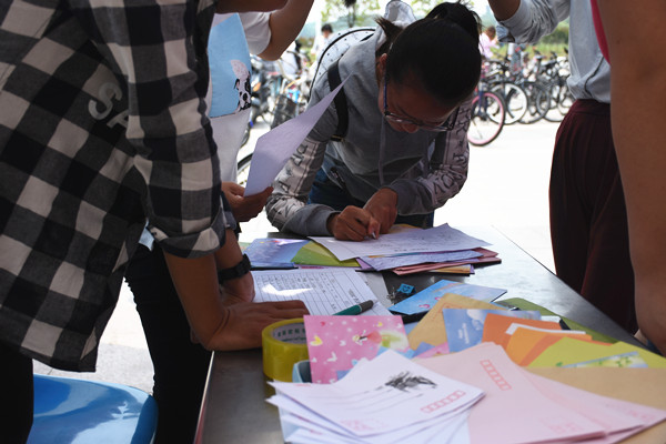 “一份简致的信笺,成为彼此的陪伴。”15级法学专业的焦娜也给自己的两位高中同桌写了信,“这个活动方便同学间联络感情,也让人重拾写信这种传统方式,毕竟写信更显得情深义重。”她说。通过两天的设点,大学生青年志愿者协会共收到了232封信件。“通过公益的方式,也可以让更多人在现代高科技的背景下,感受以前的交流方式。似乎写信离我们生活越来越遥远,很多人更经历过提笔忘字的尴尬,而这种回归传统也是对我们内心的一种召唤。”大学生青年志愿者协会会长甘俊奇说。(文/学生记者 王裴 图/学生记者 黄振君)