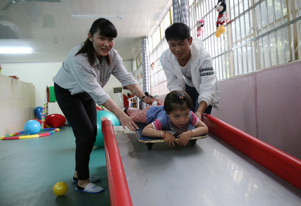 青年社会工作者协会会长王丹带着鲁香姝一起打乒乓球,另一名志愿者还教给她一种新打法,小姑娘“咯咯咯”地笑个不停。王丹说:“她喊我姐姐,对着我笑,跟她聊天,也会时不时的回答你,但是你能感觉到她与正常的孩子还是不同,精神没办法集中,也不爱跟人沟通,照顾他们真的需要很大的耐心和宽容。”