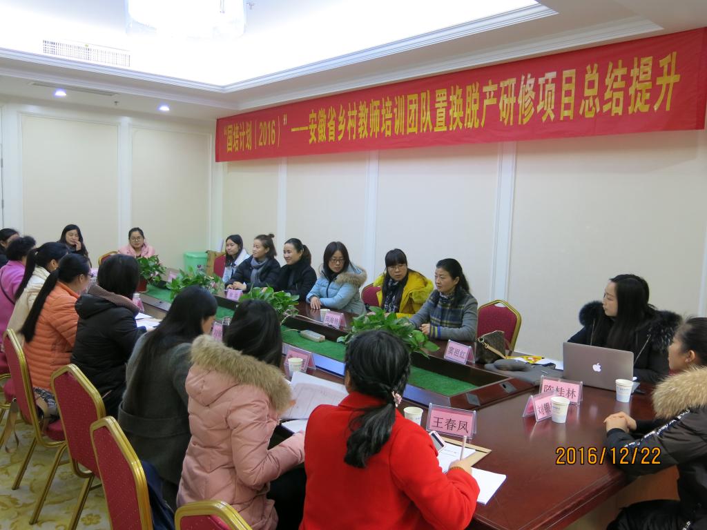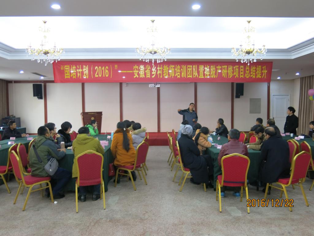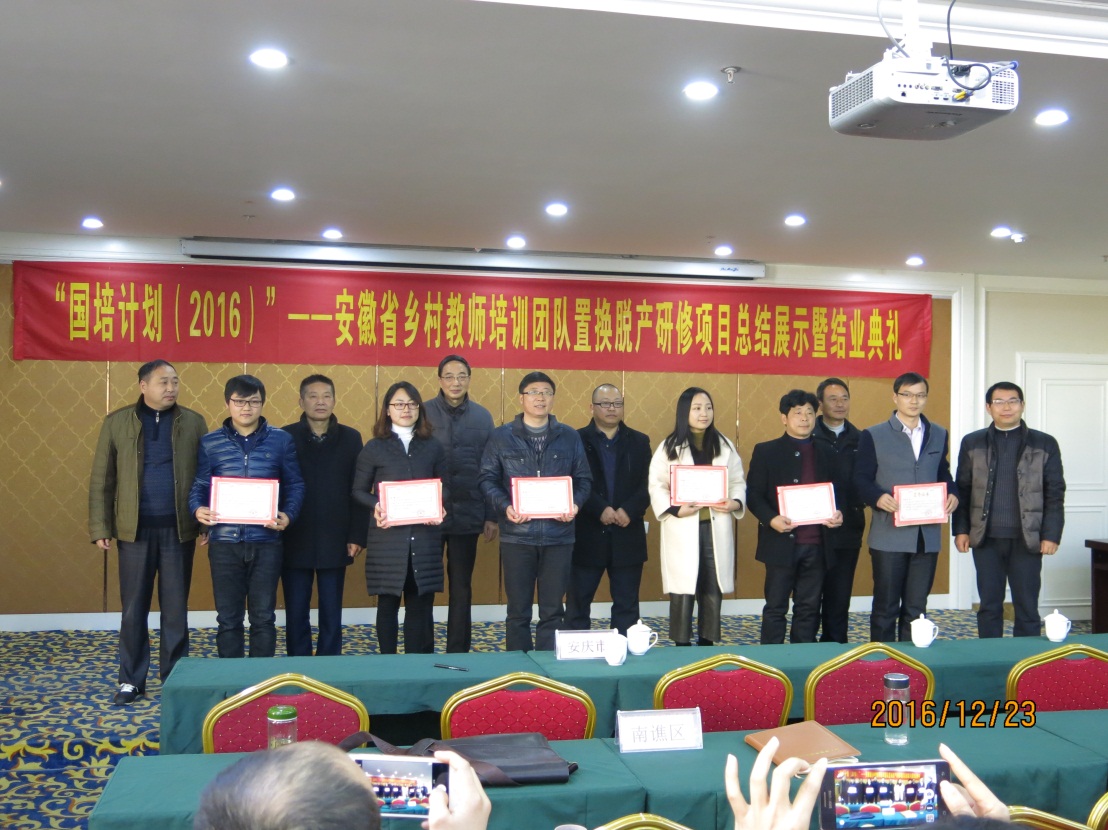 12月23日上午, 纽约国际官网承担的“国培计划(2016)”——安徽省乡村教师培训团队置换脱产研修项目举行成果展示汇报会暨结业仪式。纽约国际最新网站教师教育中心负责人、安庆市师训中心负责人和宿松、祁门、青阳、滁州市南谯区四个项目县区教育分管领导及师训部门负责人参加了学员的成果展示汇报会,并为学员颁发结业证书和荣誉证书。