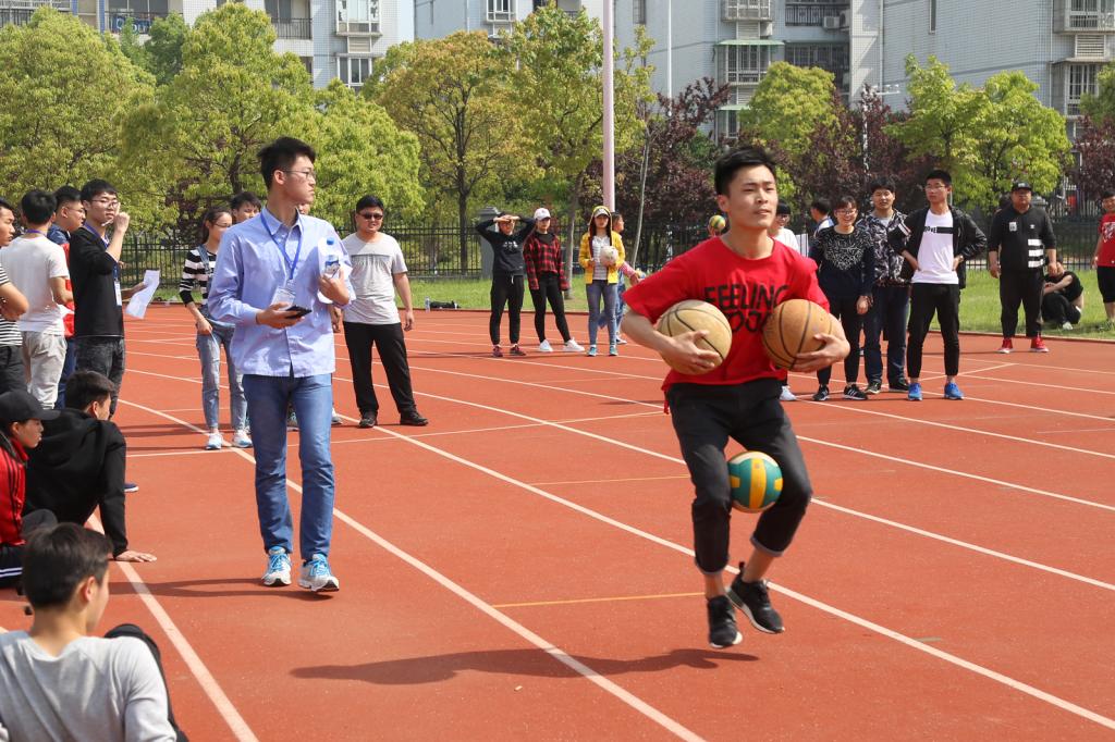 “不要急,不要慌,一定要稳住,慢慢来就好。”第二项比赛鸭子快跑开始了。参赛选手们用双腿夹住一个排球,双手抱住两个篮球,从起点出发达到转折点后返回,依次接力,直至最后一名队员完成比赛。体育学院休闲体育专业2015(1)班周通作为领队,他表示,这个项目要求每个成员速度都要很快并且在交接的时候需要默契,比较考验团队合作能力,“通过比赛也树立了团队意识,更加注重集体荣誉感。”
