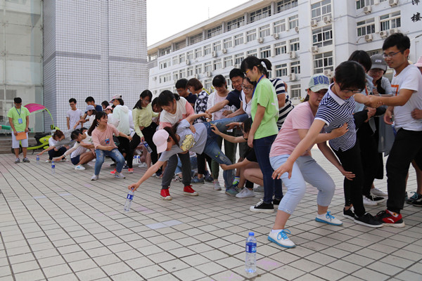 一条腿上有五只手、一只胳膊上有三只手……这是怎么回事呢?原来第一站点的游戏“群龙取水”是在指定位置放上一瓶矿泉水,每组须在不超过红线的前提下取得瓶子,于是便出现了一人身体前倾,其余人抓住这个人身体一部分的场景。自动化专业2016(1)班的李晓芸说:“我以前就玩过这个游戏,蛮有经验的。而且我们组配合得好,接连三人都很顺利地通过了。”