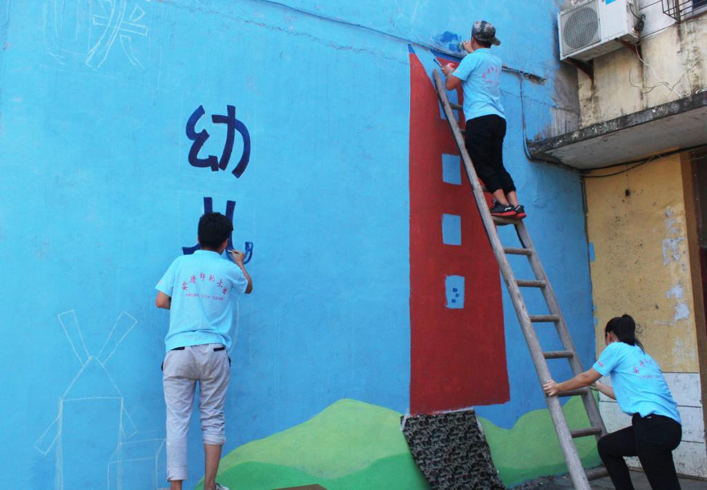 在为期六天的支教中,支教志愿者在上课之余,还带领孩子们完成教室和大观区海口镇三峡幼儿园外墙的装扮。