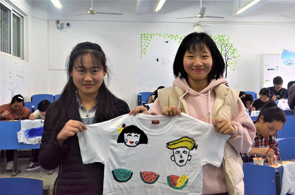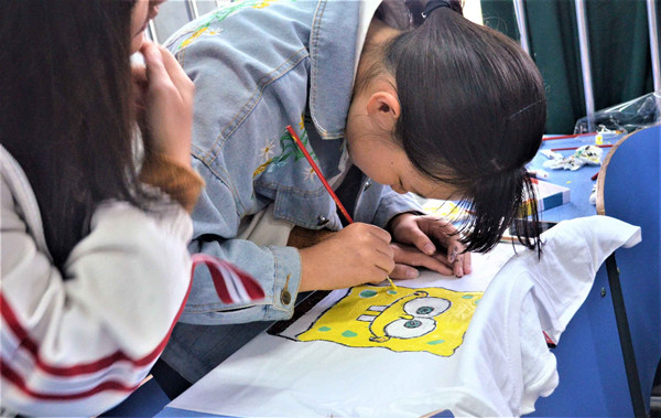 “活动现场的气氛出奇地好,简直出乎我的意料,来参加的同学们都很有热情。我在衣服上画了一个海绵宝宝,因为我从小就很喜欢这个动漫人物,而且画在衣服上也不会有违和感。”活动举办方外联部的成员、广播电视学专业2017级的孙畅同学这样描述自己对这次活动的感受。
