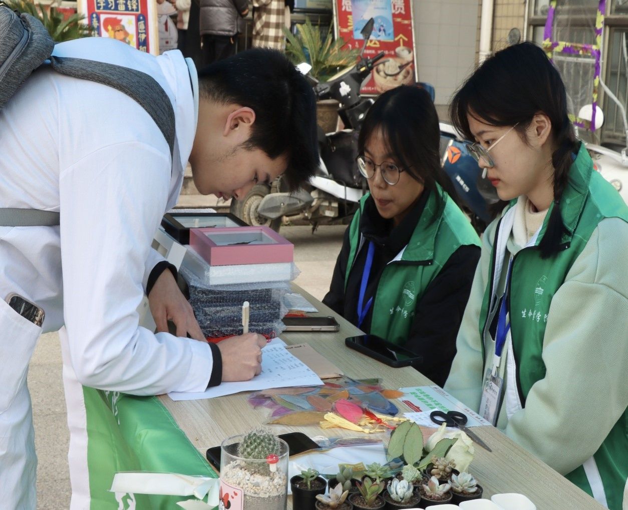 小巧玲珑的蝴蝶标本、精致美观的叶脉书签、造型各异的多肉植物……不少学生被种类繁多的商品所吸引,前来为公益助力。据活动负责人、生物技术专业2021级的车欣欣介绍,大部分义卖商品都由学生提前一周亲手制作而成,所得善款将会由生命科学学院下设绿叶志愿服务队统一购买健康果盒,于下周三送到至爱家园的孩子们手中。