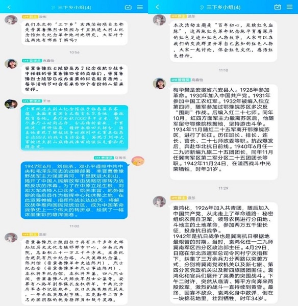 会上,队员们分享了各自调研“晋冀鲁豫”烈士陵园与“千里跃进大别山”纪念馆的过程和感受。队员们还从基本资料、相关党史等方面对两处进行对比分析,总结分析出两者的联系:1947年6月30日夜,刘伯承、邓小平率领的晋冀鲁豫野战军主力12万人一举突破黄河天险,揭开刘邓大军千里挺进大别山的战略进攻序幕。而在刘邓大军千里挺进大别山之际,由陈赓、谢富治率领的晋冀鲁豫野战军一部在8月下旬渡过黄河,挺进豫西。可以说,晋冀鲁豫野战军在千里跃进大别山中发挥了重要作用。团队进行了实践心得总结,队员们各自发表自己的感悟与看法。
