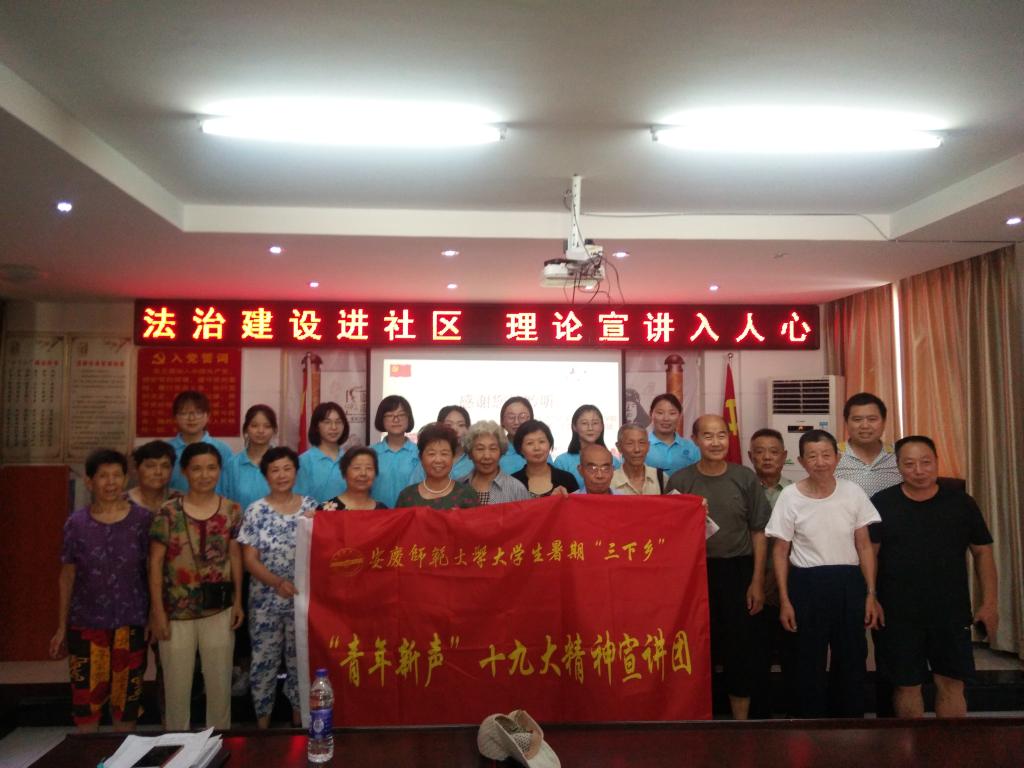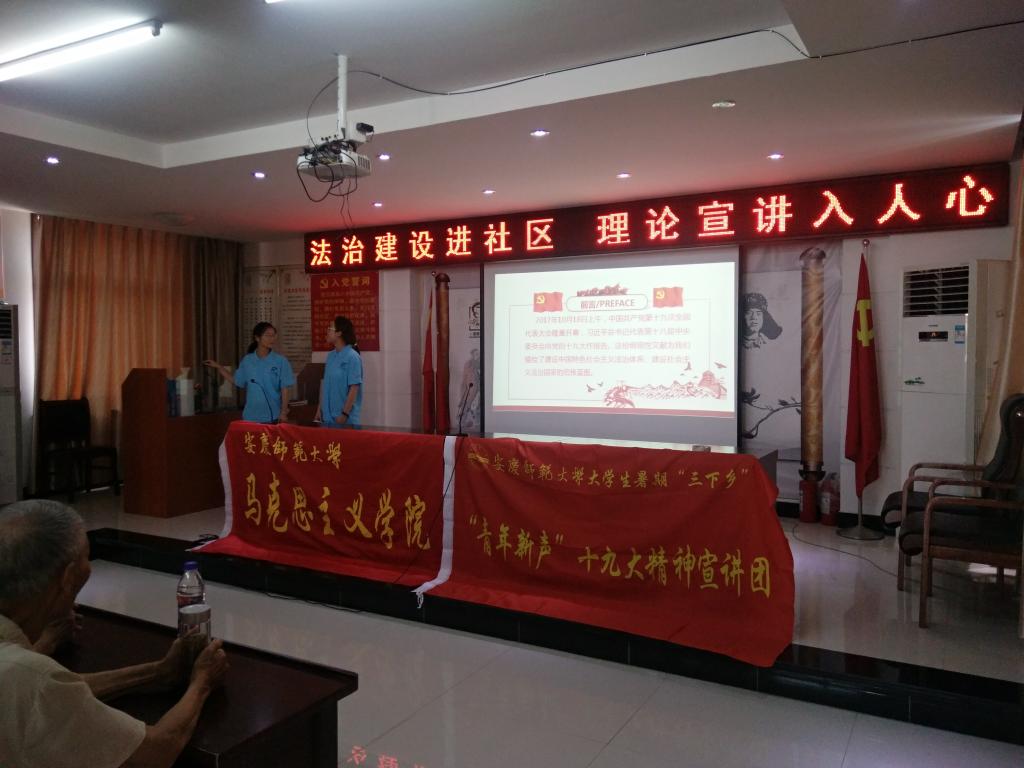 7月20日,纽约国际最新网站暑期“三下乡”国家级重点团队——“青年新声”十九大精神宣讲团赴安庆市华茂社区进行“法治”宣讲。这支由来自马克思主义学院的10名学生组成的队伍,经过前期的详细计划与精心准备,为华茂社区的居民们带来了一场别具一格的宣讲。