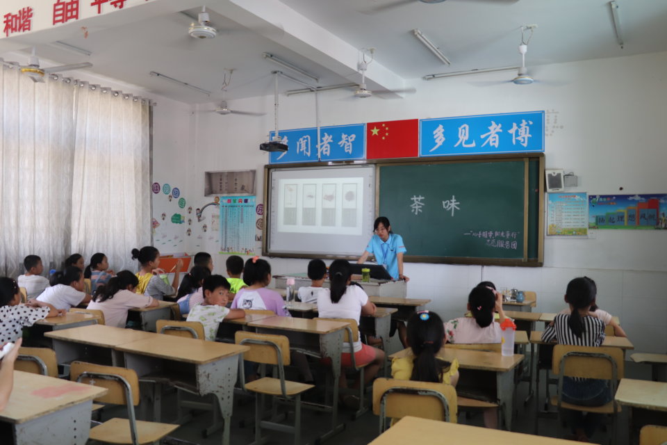 通过志愿者的讲解,同学们了解到红茶、绿茶、乌龙茶、普洱茶等茶种,也知道了它们的产地、形状和功效。在志愿者讲解后,同学们争先恐后地向老师提出问题。“茶的起源是哪里?”“喝茶对身体有什么益处?”志愿者老师耐心地一一回答,并就同学们提出的问题进行拓展。