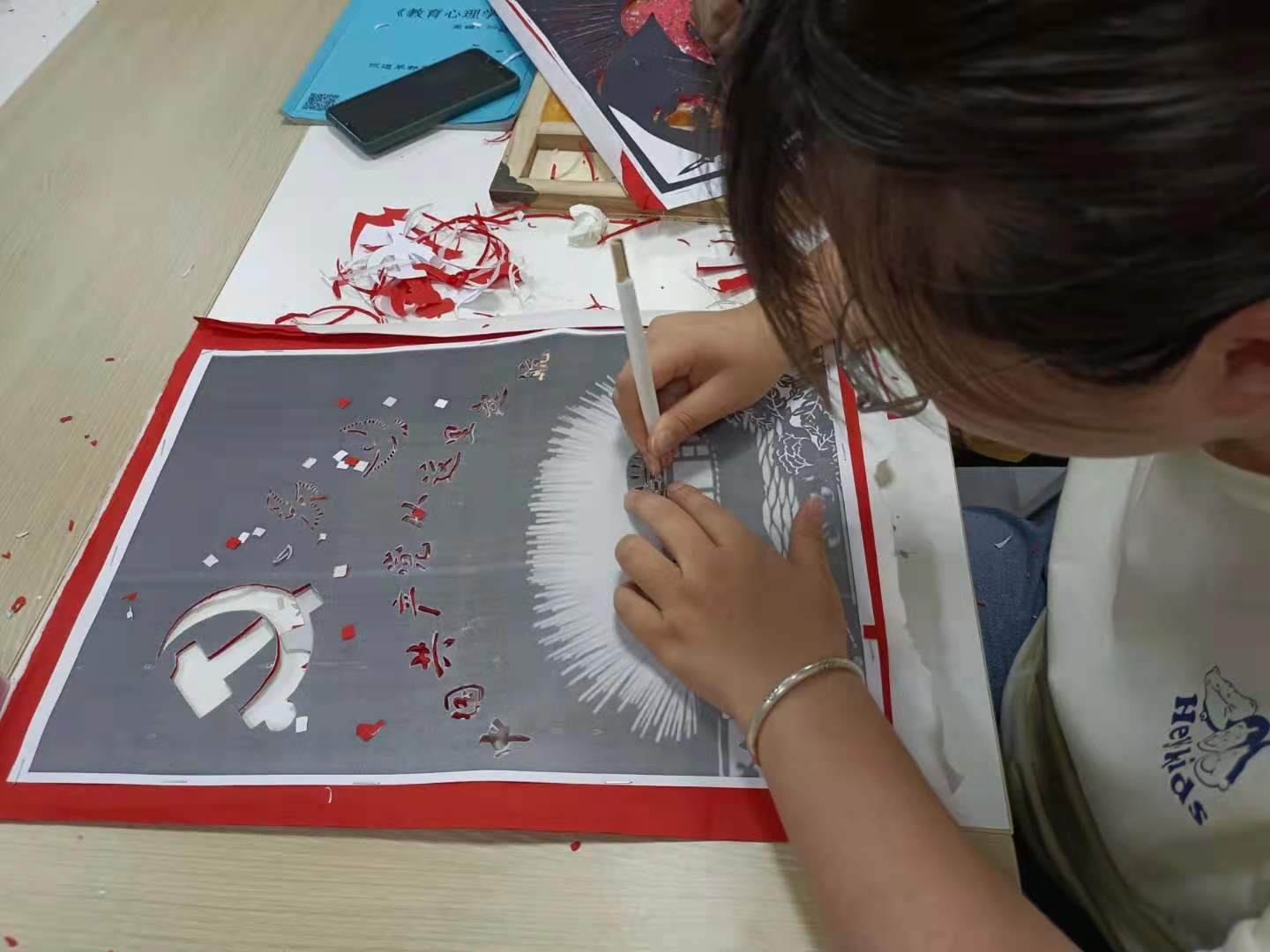 绘有党旗、嘉兴南湖红船以及中国共产党从这里开始字样的剪纸作品出自美术学专业2018(4)班的党员林青青之手。“把党的建立一步步刻下来,我觉得很有意义!”先通过制图软件做出图纸,然后进行打印,最后再将各部分内容逐一刻出,每一步骤都必须仔细认真。“完成了这幅作品,我觉得党的建立这部分历史已经刻在脑子里了。”她说。