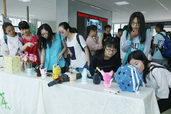“我国的水存在的问题主要有两个……”解说员娓娓道来,向参观的行人详细介绍了我国的环境污染问题以及全球十大环境问题。一张张环保摄影作品,或是弥天雾霾,或是正在冒烟的烟囱,或是满池塘的垃圾……透过镜头,参观的人们更深刻地认识到环境污染带来的严重后果。来自传媒学院广播电视学专业2016(1)班的忝杭杭说:“以前对环境污染并没有什么直观的感受,但是今天通过这些照片真的深刻认识到了环境污染的严重性。”而现场资环学子们用快递盒子做出来的星星灯、用鸡蛋壳拼出来的孔雀、用便利贴折出来的小猫等精致而又富有创意的手工艺品更是引来了不少路人的围观。