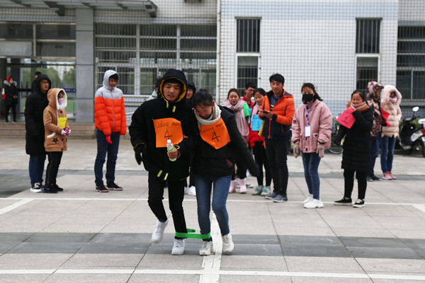 男生双眼被蒙着,背着女生在摆着障碍物的“S”型道路上前行,女生则一路指点方向,“盲闯地雷阵”项目获得了在场所有人的青睐。裁判员一声令下,有的男生尝试着迈着步子,有的横冲直撞,有的则是在女生的指导下稳步前行。旁边的围观人员目睹着每一组的战况,看到有的男生不听指导胡乱闯的,则哄笑一片。比赛结束后,大家仍然意犹未尽,讨论着比赛过程。