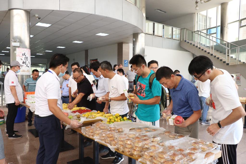 教师张二远还没走进食堂就看到了门外的宣传海报。当他走进食堂看到里面摆满了品种丰富的水果、精致的面点等食物时,觉得特别喜庆,浓郁的氛围让他感到很欢喜,他笑称,“这种感觉就像自己在过生日一样!”