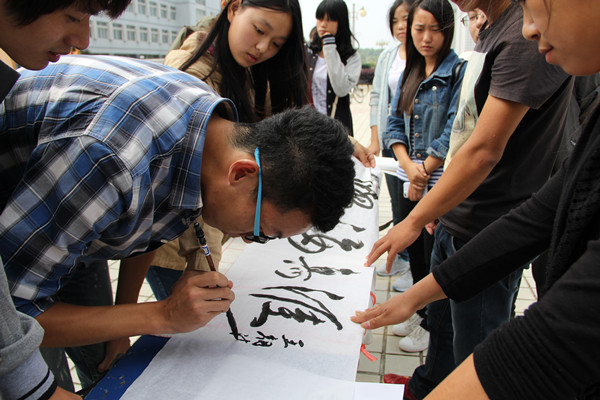 “学无止境”,一位同学率先在现场写出了这样一幅书法作品,其余同学也纷纷拿起毛笔创作起来。美术学院14级新生郭康也加入进来,创作了自己的书法作品。“我只学了一段时间的书法,写得不太好,”郭康腼腆地说道,“我很喜欢这个活动,也很喜欢学校这种文化氛围。”