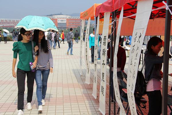 各位亲们,10月9日在教学楼广场上,你们看到摆放的精美书画了吗?书画里面有你的作品吗?这是“醉墨秋香”大型书画展,现场一幅幅书画作品,吸引着众多过往的同学们驻足观看。