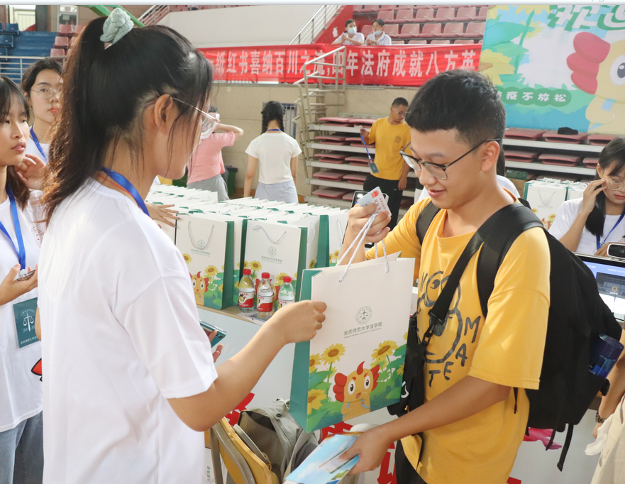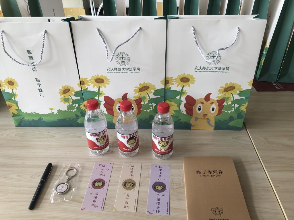 “看到学长学姐们精心准备的礼物很感动也很暖心,学长学姐们也都特别的热情,让我刚来的紧张都消失了。”法学专业2021级(3)班的黄文蓉边说边打开了新生礼包,里面是学院专门定制的印有吉祥物“小角”图案的笔记本、笔、书签、钥匙扣等物品, 其中专门定制并印有“疫情防控 从我做起”、“阳光长跑 身体好好”和“法院学子 样样第一”字眼的矿泉水更坚定了小萌新们做好疫情防控、参加体育锻炼和努力刻苦学习的信心。