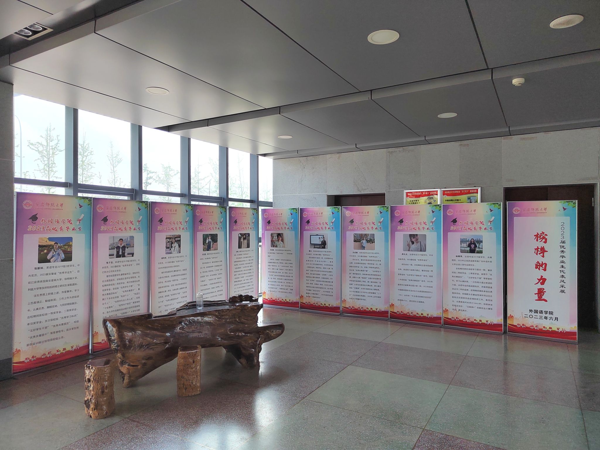 近年来,外国语学院建立了融大学生思想政治教育、生活指导、学习指导、职业生涯指导、就业创业指导、心理健康指导等为一体的学生指导与服务体系,以培德、导航、读书、双创、榜样五大工程为抓手,不断促进学生成长、成人、成才,取得了良好的育人效果。2023届毕业生考研上岸55人次,考研录取率较往年有显著提升;成功考上选调生1人,扎根基层一线为人民服务;多位毕业生在学校、银行、国企实现高质量就业;多名2023届毕业生在校期间在中国“互联网+”大学生创新创业大赛、“田家炳杯”全国师范院校师范生教学技能竞赛等AB类赛事中获得佳绩。学院制作展板,展示优秀毕业生和优秀毕业生党员风采,发挥先进典型的示范作用。