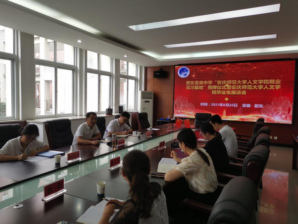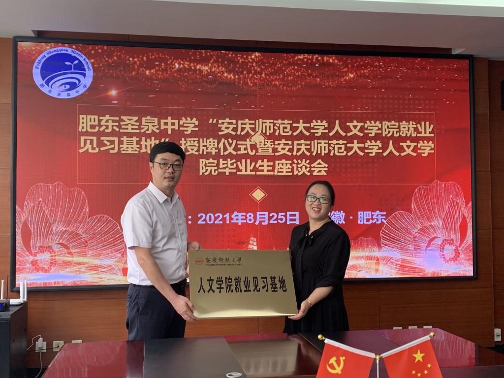 党委副书记王波代表学院为肥东圣泉中学授予“人文学院就业见习基地”牌匾。与会人员就人才培养质量、就业见习基地建设等方面展开了深入交流。