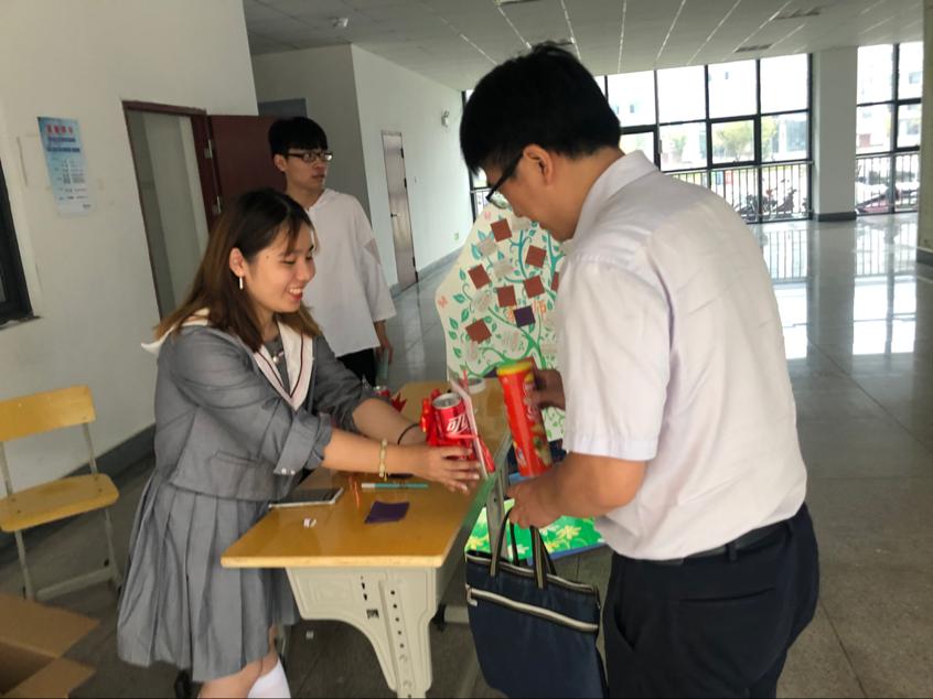 线下祝福,礼赠教师。数理学院学生会成员一大早就在学院门口就支起了展板,摆放好礼品,准备迎接老师。每一位经过的老师都将获得一份专属的教师节礼包,同时也鼓励各位同学在展板上写上对老师最真挚的祝福,更有学生亲手书写书法作品赠送老师。