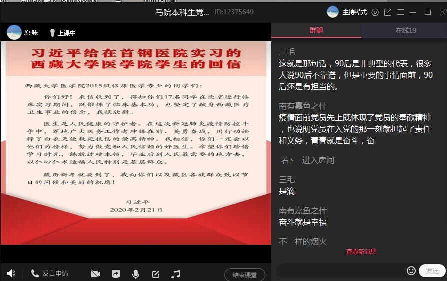 3月18日下午,一场特殊的线上党员大会正在进行着。会议由马克思主义学院本科生学生党支部书记贺佳欢主持,全体本科生党员参加了此次大会。