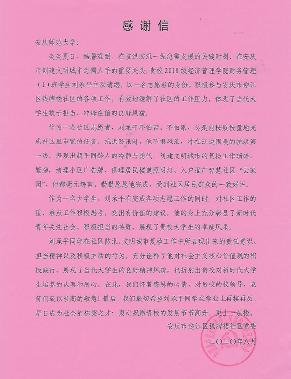 刘承平同学平时也经常积极参加学校和社区组织的志愿服务工作,志愿服务平凡而光荣,从刘承平身上我们看到了新时代青年大学生的责任与担当。(撰稿:应超 审核:周毅)