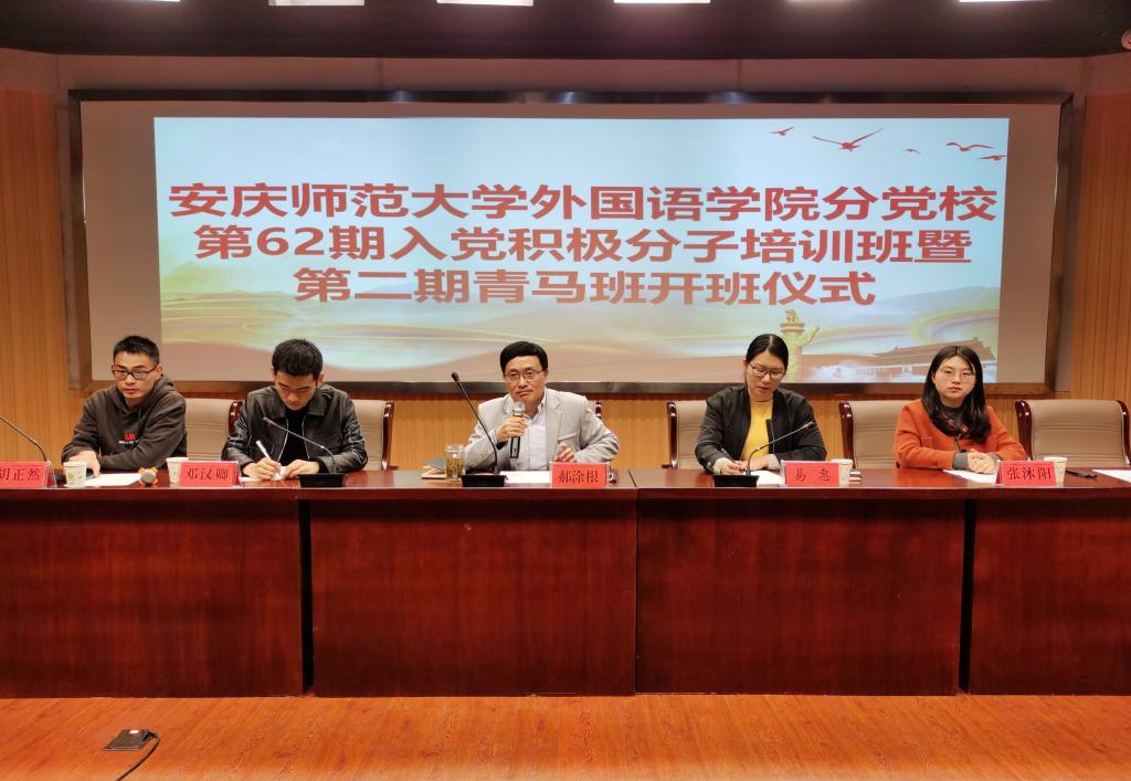 11月4日,外国语学院分党校举行第62期入党积极分子培训班暨第二期青马班开班典礼。校党委委员、外国语学院党委书记郝涂根,各学生党支部书记,第62期入党积极分子培训班全体成员及学院第二期青马班成员参加此次仪式。