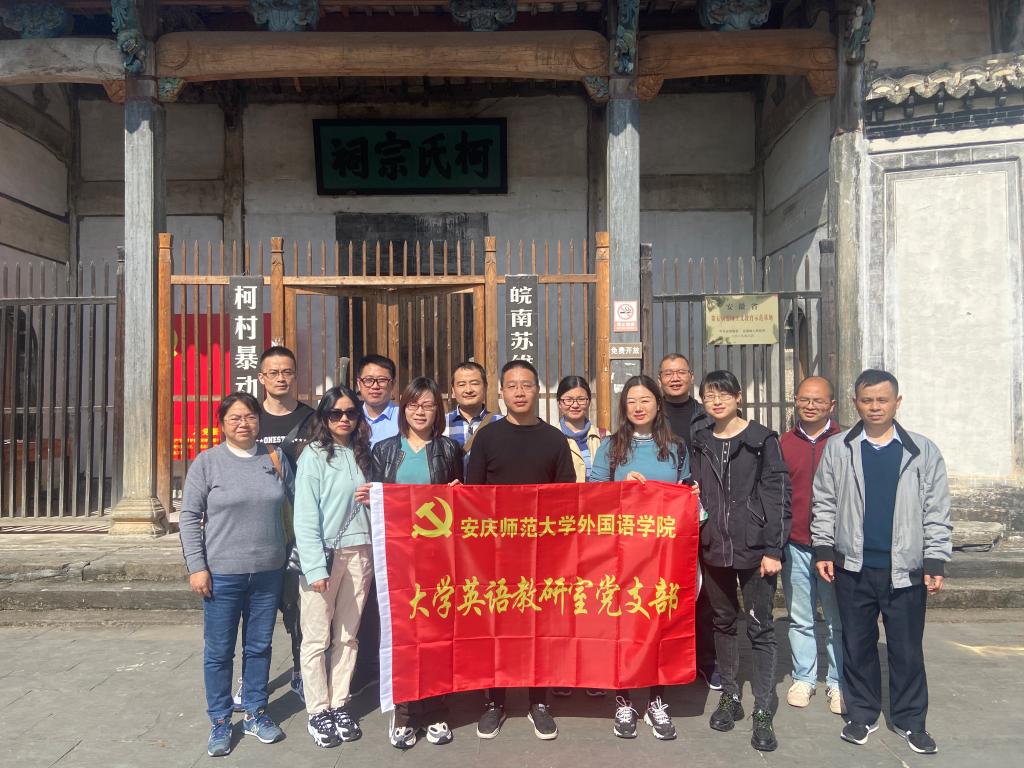 近日,大学英语教研室党支部部分成员在外国语学院党委和院工会的组织带领下赴革命老区黟县柯村,开展以“学四史,守初心”为主题的革命传统红色教育活动。此次活动通过缅怀革命先辈,践行初心使命,让支部成员在精神上受到了洗礼,进一步增强了爱国主义精神。