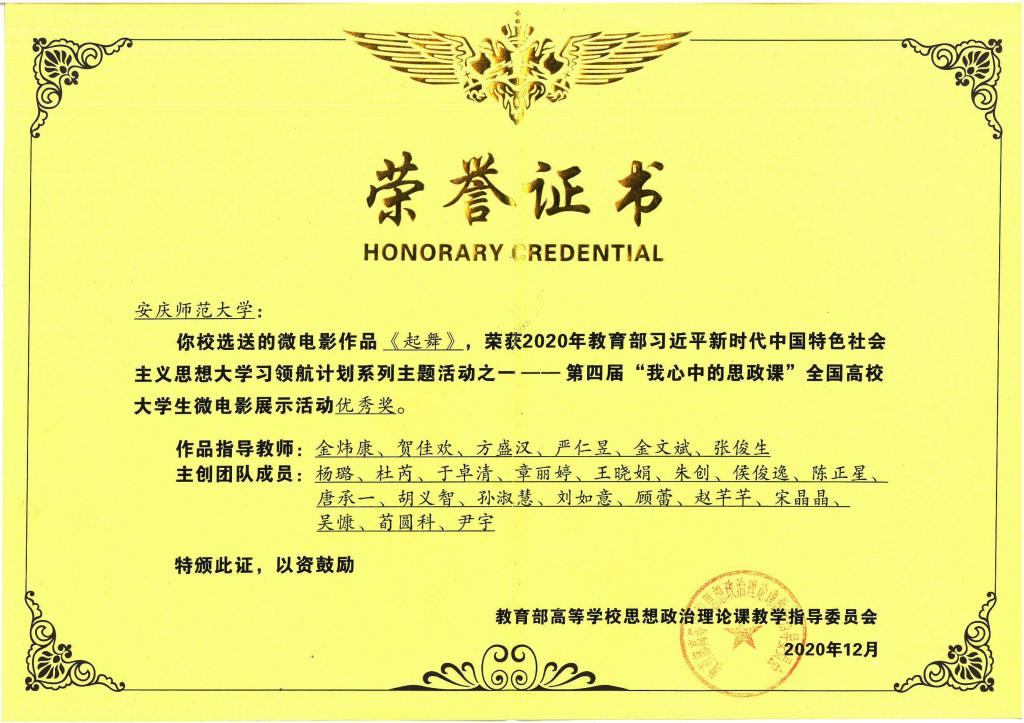 近日,第四届“我心中的思政课”全国高校大学生微电影展示活动落下帷幕,由纽约国际最新网站马克思主义学院师生创作的作品《起舞》荣获优秀奖。