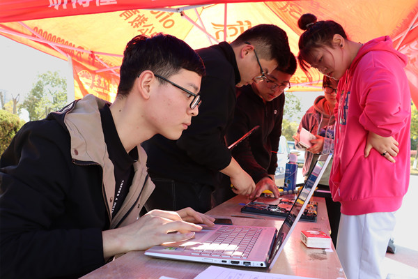 “我的电脑连不上网络,请问这边可以维修吗?”在得到肯定的答案之后,社会工作专业2018级的梁魏梅就把电脑留在了活动现场。只见计算机类专业2020(4)班的刘郑熟练地下载了一个驱动,顺利解决了梁魏梅的问题,并连接手机热点对电脑进行检查,确认无误后才关上电脑。
