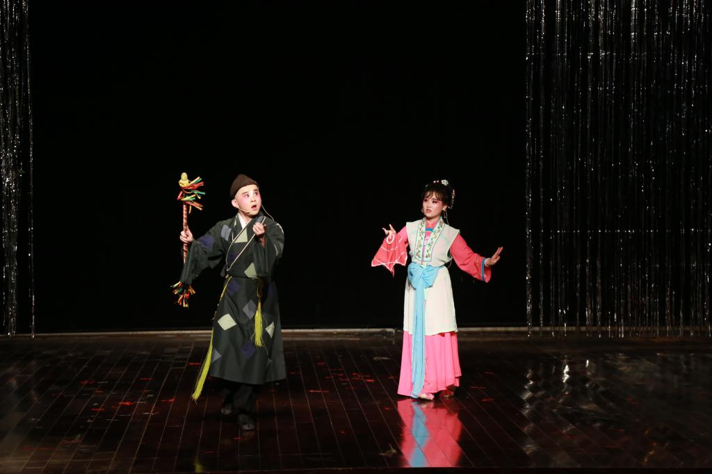由洪薇、王庆芳等人演出的折子戏《鹊桥》唱腔淳朴清新、悠扬动人,开嗓即将观众带入到了《天仙配》的故事当中。《拾玉镯》讲述孙玉娇三拾玉镯终成良缘的故事,演员胡圆通过眼神和肢体的完美配合,充分表现了小姑娘孙玉娇的丰富内心情感。“拾玉镯时,孙玉娇一会儿转转眼珠想计策,一会儿假装淡定却羞答答地笑,两只手搓着身体,着急、羞涩、好奇真的被演员极其到位地表现出来了。”音乐学专业2017级的万炎说。