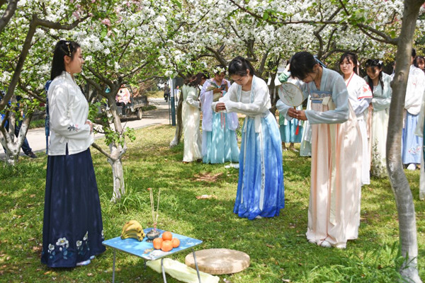 在一棵开满鲜花的海棠花树前,社员们摆放好祭品和香炉,身着汉服的12名同学扮演“十二花神”,面对祭台分两队依次排开。一切准备就绪后,身穿汉服的“赞礼”开始主持祭祀仪式。焚香、祭酒、供果、上茶、摆花,主祭祭拜完以后,其他参祭者们依次向百花之神行拜礼,场面庄重典雅。