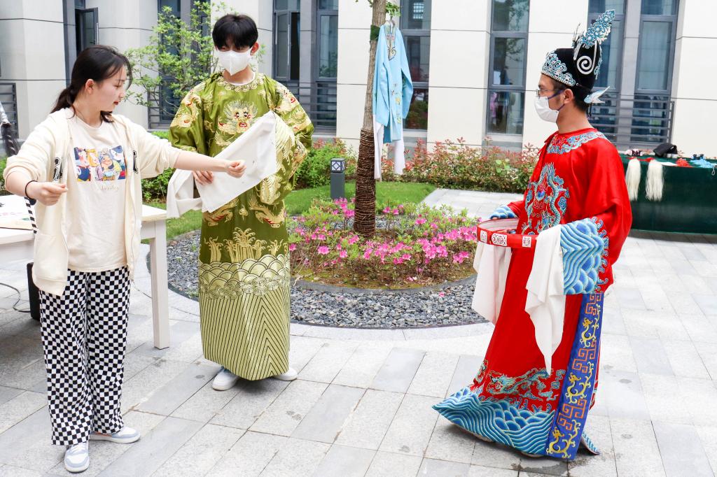 除了道具,美术学院还为学生们“借”来了黄梅剧艺术学院表演专业的学生,为人们进行戏曲表演。黄梅声声入耳、把式专业精彩,学生们在庭院内时走时看,时而穿上戏服,仿佛置身梨园。身穿红色蟒袍,帽插宫花,美术学专业2021(4)班江兆京笑称自己成了“状元郎”,来到活动现场的他迫不及待为自己选择了一件《女驸马》中的戏服,可迫于盔头的重量,不一会儿他就将戏服换了下来。“今天我才真正明白什么叫‘台上一分钟,台下十年功’啊!”他感叹道,自己光是穿这身行头都很困难,很难想象戏曲家们是花了多少功夫才能在台上来去自如的。