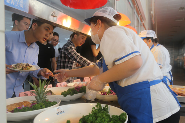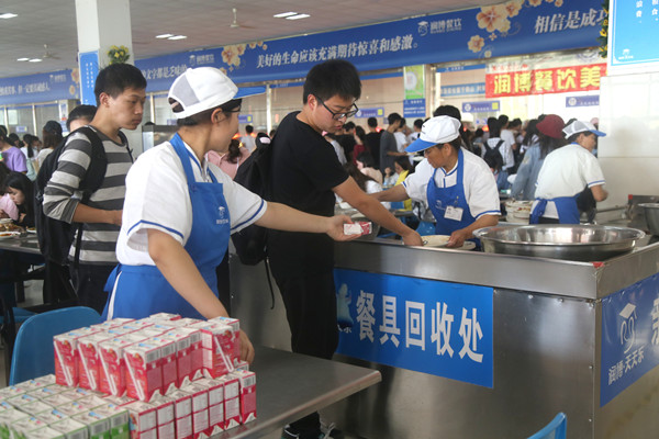 清晨,当你走进食堂,热情的阿姨招呼你来取一个鸡蛋;晚上将餐盘送往回收处时,阿姨回赠你一杯酸奶,这是“早晚用餐获赠送”的活动。活动期间,食堂每天累计送出1000份鸡蛋和800盒酸奶。
