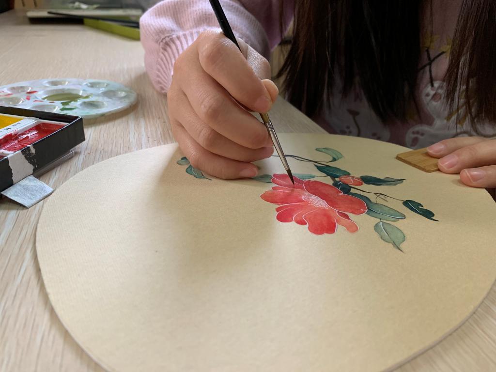 美术学专业2018(2)班朱英娇的扇子上是一簇盛放的紫薇花。“我平时上下课都会经过学校的紫薇园,开放的紫薇花真的很美!”她说,紫薇花的花语是幸福好运,“邀请函”上画紫薇花是希望新年新气象,可以给大家带来好运气。