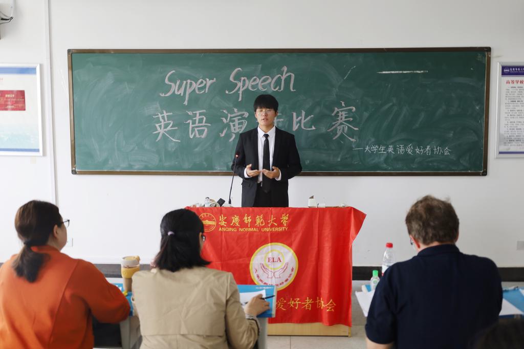 4月27日,大学生英语爱好者协会举办“Super Speech”英文演讲比赛决赛,外国语学院教师王爱琴、曹敏、王巧英及外教Simon、Doug出席担任评委,共有20名选手参与本次比赛。
