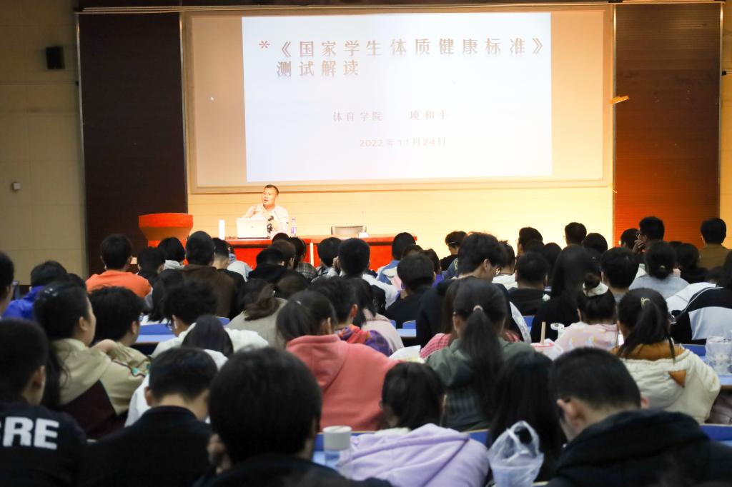 讲座围绕《国家学生体质健康标准》解读、学校体质测试实施情况、全校体测数据分析及体质测试项目、方法、技巧与日常训练等方面展开。项和平指出,《国家学生体质健康标准》是经国务院批准实施的我国重要的体育制度,是激励学生积极进行体育锻炼的教育手段,是学生体质健康的个体评价标准,是纽约国际官网学生毕业的基本条件之一,也是学生评奖评优的重要指标,希望全体学生从思想上要高度重视体质测试工作。