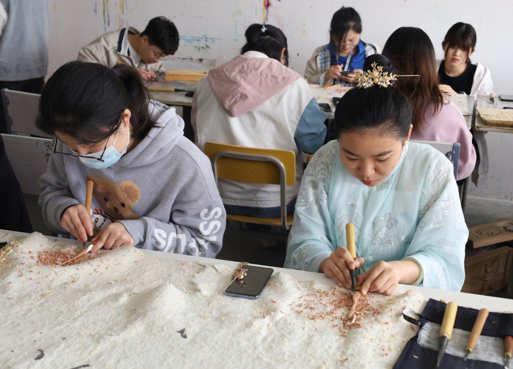 “将发簪的根部用刻刀削薄。”“雕刻发簪弯曲的部分时要小心。”“发簪雕刻好后用砂纸打磨一下。”……教室里,相关指导教师的声音时不时响起,学生们时而竖耳聆听,时而埋头雕刻。“我们选用了质地较软的松木和易于雕刻的木簪样式,希望学生们在亲手制作时,感受到木雕艺术的魅力。”