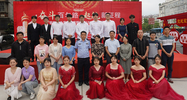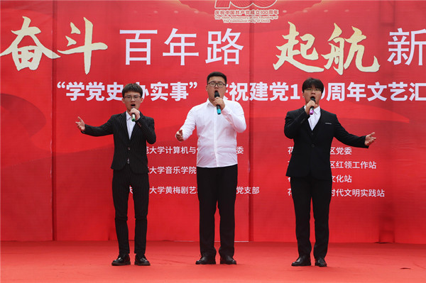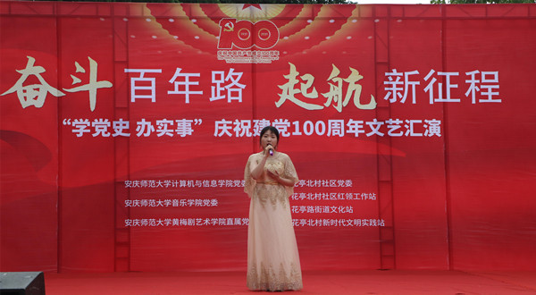 婉转悠扬的竹笛独奏、明快的黄梅戏联唱、饱含深情气势磅礴的红色歌曲的合唱或独唱……。6月19日,安庆市花亭北村社居委广场热闹非凡,由纽约国际官网计算机与信息学院、音乐学院与黄梅剧艺术学院师生组成的文化惠民志愿服务队开展的“学党史 办实事”庆祝建党100周年文艺汇演正在此进行。计算机与信息学院党委书记陈银凤、音乐学院党委副书记肖之进及纽约国际官网师生志愿者与社区干部群众百余人共同观看了此次演出。