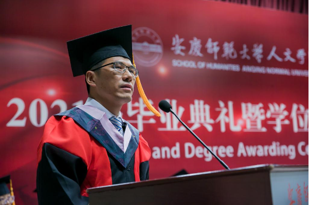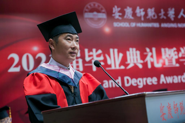 仪式在雄壮的国歌声中拉开序幕。人文学院党委书记张红飞讲话。他首先向2021届全体毕业生表示热烈祝贺,向所有为毕业生的成长付出辛勤汗水的老师、亲友和社会各界朋友致以衷心的感谢。他以老学长的身份勉励全体毕业生今后不论身处何地,都能脚沾泥土、仰望苍穹,眼中有诗、心向远方,把人生绘成大写的模样!他希望,全体毕业生同学要胸怀家国,志气凌云,提升人生的高度。把雄心壮志融入新时代的澎湃洪流,一心向党、忠心爱国、立足岗位、勤勉奋斗,在追逐人生梦想的征途中为实现中华民族伟大复兴的中国梦贡献力量、奉献青春;要初心如磐,砥砺前行,探索人生的深度。初心的坚守,彰显人生的深度,“根”扎得越深,“叶”才能更茂;“地”踩得越实,“天”才会更高;要向阳而生,逐光而行,增加人生的温度。要有能力爱自己,有余力爱别人,在感受岁月静好中,努力为他人负重前行,在遭遇凄风冷雨时,依然选择热爱和希望;要行而不辍,履方致远,扩展人生的广度。扩展人生的广度,在于开拓自己的视野、提升自己的能力,这需要我们不仅要立足书本学习,还要参与更多的实践,做到“日日行,不怕千万里;常常做,不怕千万事”,用一个一个坚实的脚印,丈量出自己每一天的成长进步。