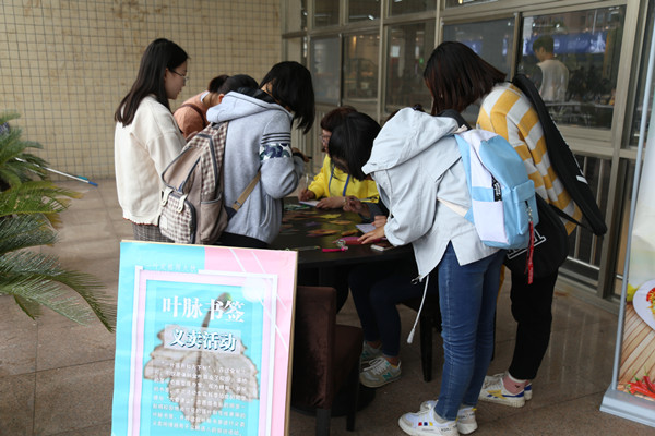 活动刚开始,义卖摊前就挤满了学生,精美的叶脉书签受到了同学们的一致好评。旅游管理专业2018(2)班的何天翔拿着手中彩色的叶脉书签说:“买到的两个书签都很精致,其中一个可以放在平时看的书中,而另一个书签打算寄给即将过生日的女朋友。”