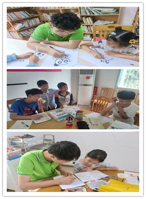 “先画一个圆圆的脑袋,再给脑袋安装两个黑色的耳朵。”在小朋友们要求下,团队成员、电子信息科学与技术专业2020(1)班的汪自瑞带领小朋友们拿起彩笔开始手绘大熊猫。他一边向孩子们介绍着大熊猫的外貌特征,一边查看小朋友们的绘画情况。