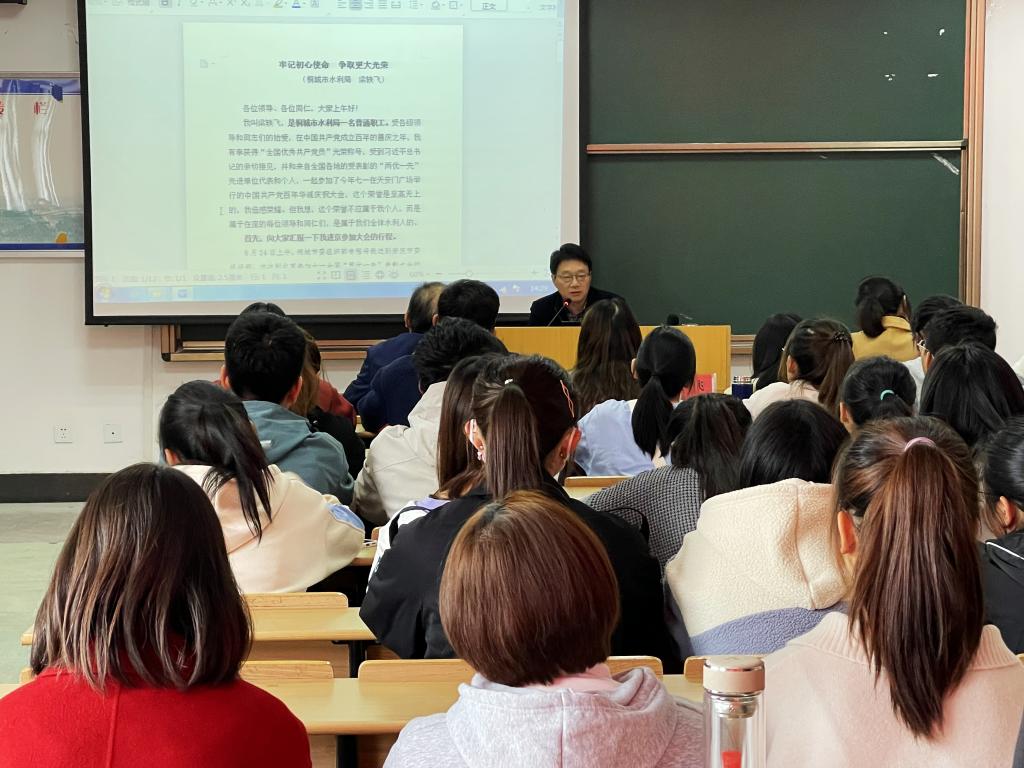 11月17日,马克思主义学院、学校党委宣传部、安庆市委宣传部、学校团委举办“思政大讲堂之先锋模范人物进校园”专题报告会。全国优秀共产党员——安徽省桐城市水利局党组成员、水利局水保工程建设管理所所长梁轶飞受邀作报告,学院党委书记金文斌、学校团委副书记赵丽丽、学院团委负责人与120多名学生代表参加本次活动。