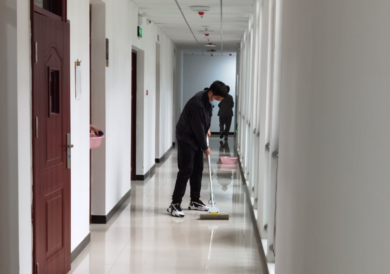 在师生们的相互配合下,清扫工作有条不紊地开展。一眼望去,从大厅入口到教室,从楼道口到模拟法庭,从教研室到办公走廊,师生忙碌的身影成为法学院0楼一道独特的“风景线”。有序的清扫如火如荼地进行,有的三人一组用抹布轻轻擦拭门窗与玻璃;有的同学用拖把打扫教室地面;有的同学认真清理楼梯间杂物,有的老师用铲子清理门窗的污迹。大家各有分工、齐心协力,利用拖把抹布铲子,狠抓细节,不留死角。