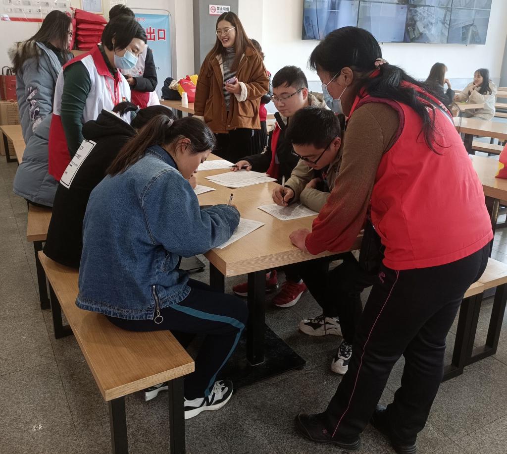 在志愿者和安庆红十字中心血站的医护人员的引导下,前来献血的学生们排队依次进行献血前的准备——填写表格、测量体重、检验血型。虽然活动期间天气较冷,但献血的同学们热情不减,人数也逐渐增多。