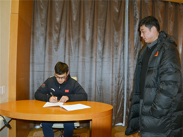 慰问结束后,为了让沈俊鑫同学全心全意备战2022年北京冬奥会,同时能顺利完成学业,学院送考上门,最终在专业老师的监考下,沈俊鑫同学顺利完成了本学期期末相关课程的考试。