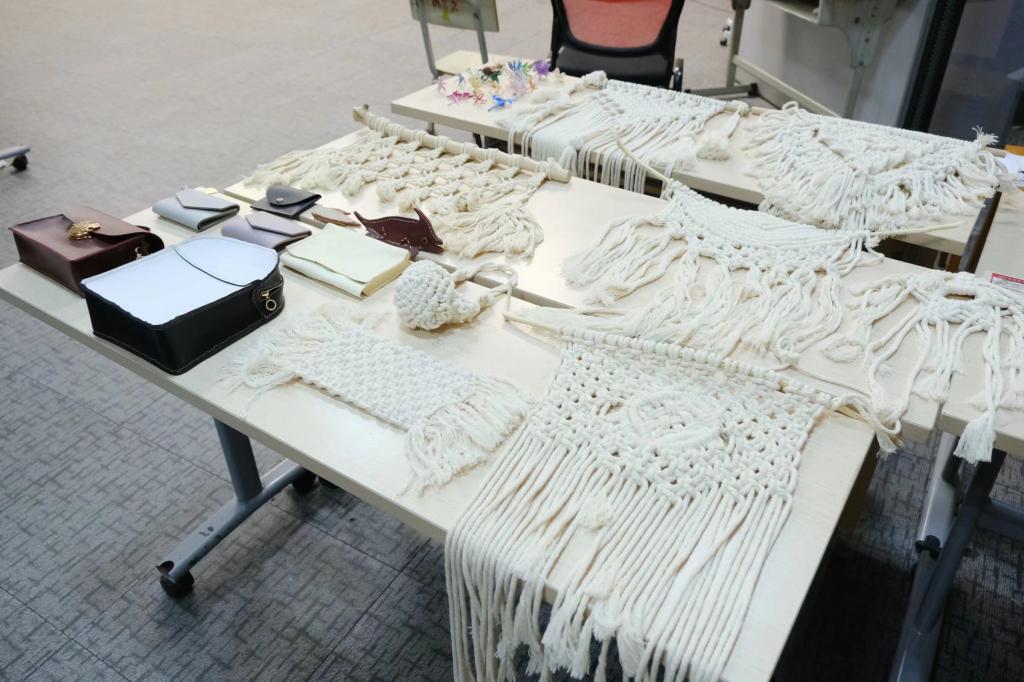 斜挎包、手提包、马鞍包、手工编织挂饰、荷花缠花、梅花缠花……每个班级的作品一一陈列展出,同时选出代表对作品进行介绍。对于学员介绍的作品,汤小曼逐一进行分析指导,“皮具颜色很好,但是形式过于单一,思想不够跳脱,款式方面可以有更多的创新。”