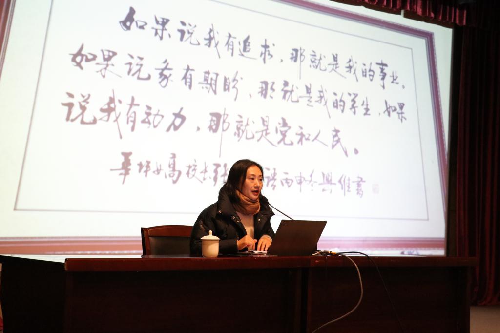 杨春还谈到自己对教育和教师的认识。她先以共和国勋章获得者钟南山院士的抗疫事迹为例,发掘他在日常、生活中的众多小事,鼓励学生厚植家国情怀、铸就高尚人格。她还引用了2020年全国教书育人楷模张桂梅老师的事迹。作为一名教师,张桂梅时刻把学生放在心中,克服种种艰苦。她辛勤教书,为来自山区的孩子们创造光明的未来。谈及张桂梅老师,杨春老师动情地表示:“作为一名人民教师,我们应当培养专业信念和情怀,心怀大爱,铸就高尚师德!”