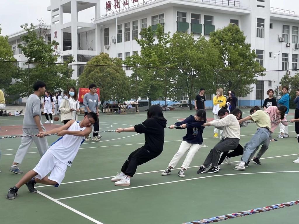 “拔河比赛开始!”裁判员一声令下,双方选手拧着麻绳,龇着牙,身体向后倾斜,绳上的红布条也被拉得左右摇晃,边上观众大声鼓励加油,这是龙山校区东田径场上教师教育学院举办的2021年趣味运动会的场景。