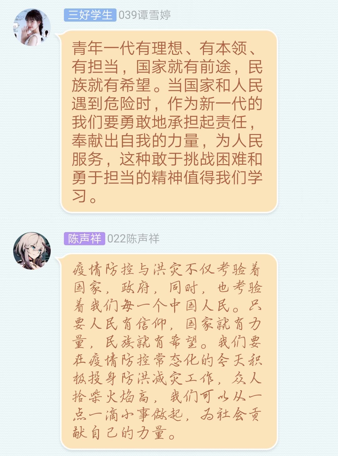 为了更好地宣传郑姣姣同学的先进事迹,马克思主义学院近日在全院召开“学习00后女大学生主动请缨先进事迹”的主题班会。各班同学通过群课堂一起观看了郑姣姣事迹的报道视频。观看结束后,同学们纷纷发表了感想。2019级思想政治教育三班的陈巍巍说:“我们身为平凡的人,小小的心里也应该承载着大大国家和故乡!在这种特殊时期,这种志愿服务的行为很值得我们学习!”“青年有责任有担当,国家和民族才有前途有希望。在社会和国家需要之时,我们应当挺身而出,努力奉献,彰显青年的责任与担当!”2019级思想政治教育专业的黄雨格同学说道。活动开展过程中,郑姣姣同学还与大家分享了自己的志愿服务经历和防汛安全知识。(撰稿:田梦甜 审核:金文斌)