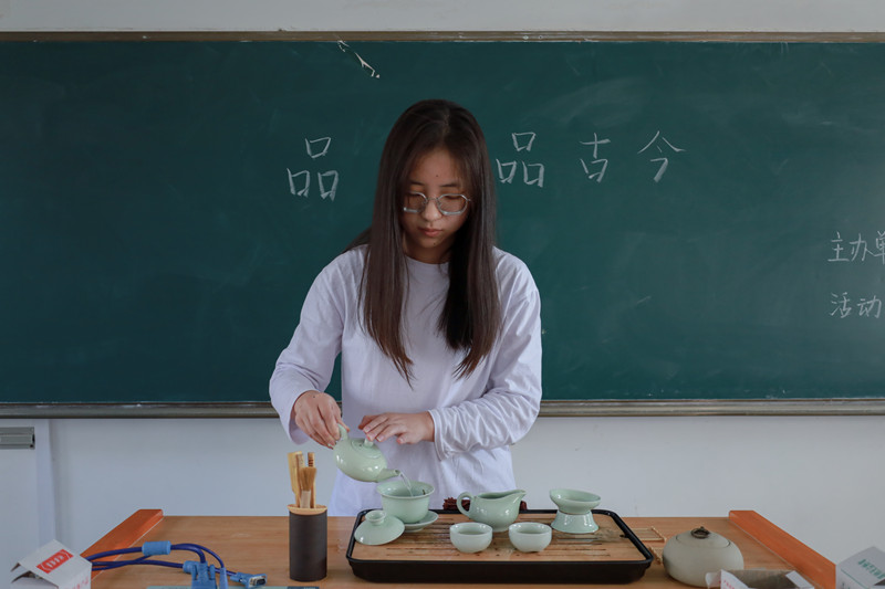 在清幽的茶香中,学生们陆续上台展示茶艺。“茶礼有缘,古已有之”,茶与礼向来密不可分。泡茶的第一步便是行茶礼,以表示行茶艺者发自内心的真诚。接下来温杯烫盏,洗茶滤水,泡茶出汤依次进行,每一步都不失从容、有条不紊,无一不彰显着学生们对待茶艺认真的态度和台下勤奋的练习。“每次泡茶时我都很专注,享受那一份内心的宁静,我觉得泡茶不仅是一门技术,同时也是一种心境。”中国语言文学类专业2021(4)班的施睿玲分享泡茶体会时说。