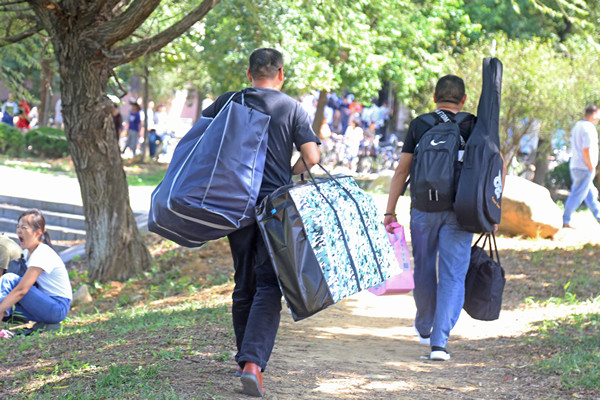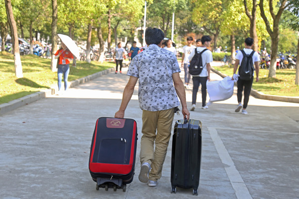 在父母眼里,孩子永远长不大。2018年的迎新报到日,校园内到处都是肩扛背驮重行囊的父母们,他们陪孩子一起上大学,替孩子们背行李。他们肩扛背驮的不仅仅是行李,还有沉甸甸的爱。